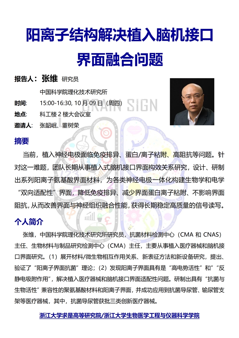 学术报告:阳离子结构解决植入脑机接口界面融合问题——张维研究员(中国科学院理化技术研究所)