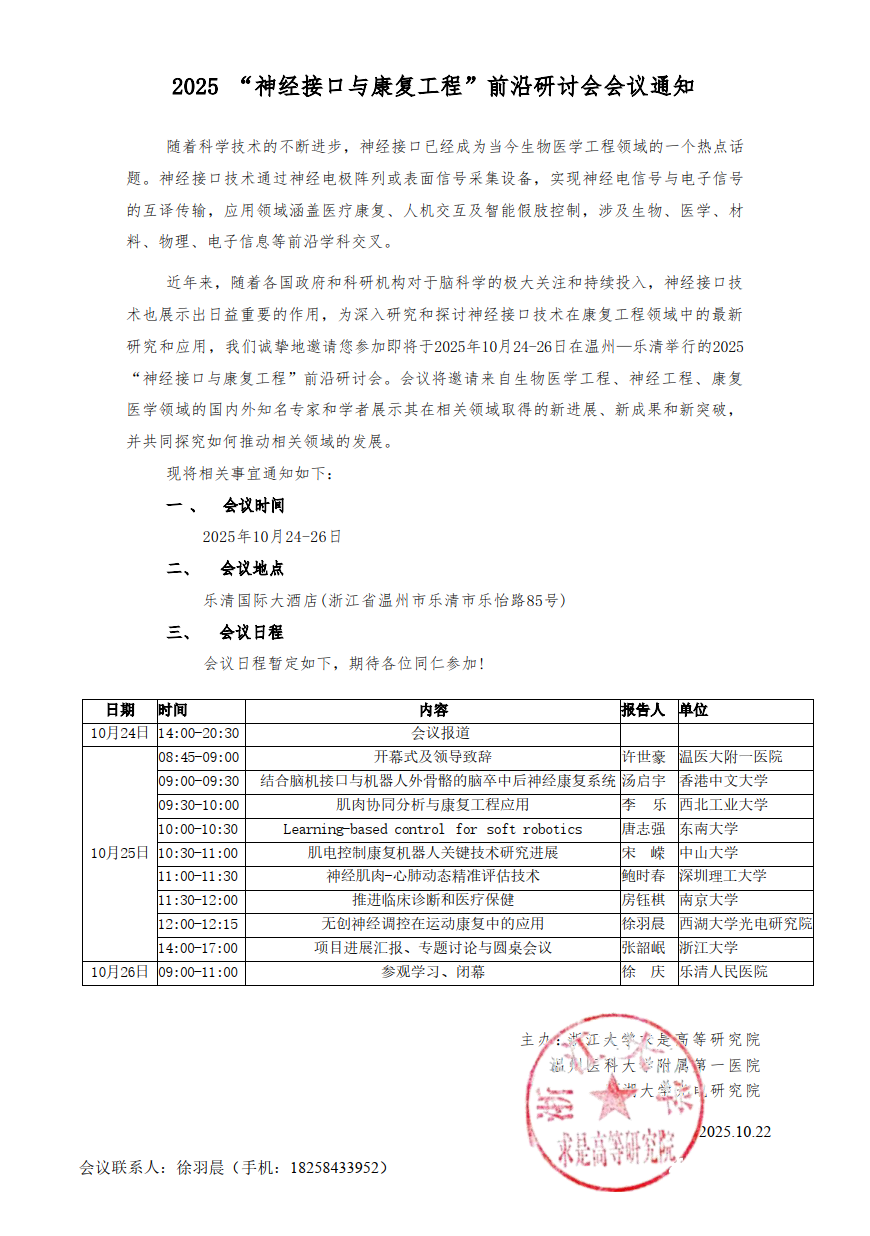 会议通知:2025 “神经接口与康复工程”前沿研讨会