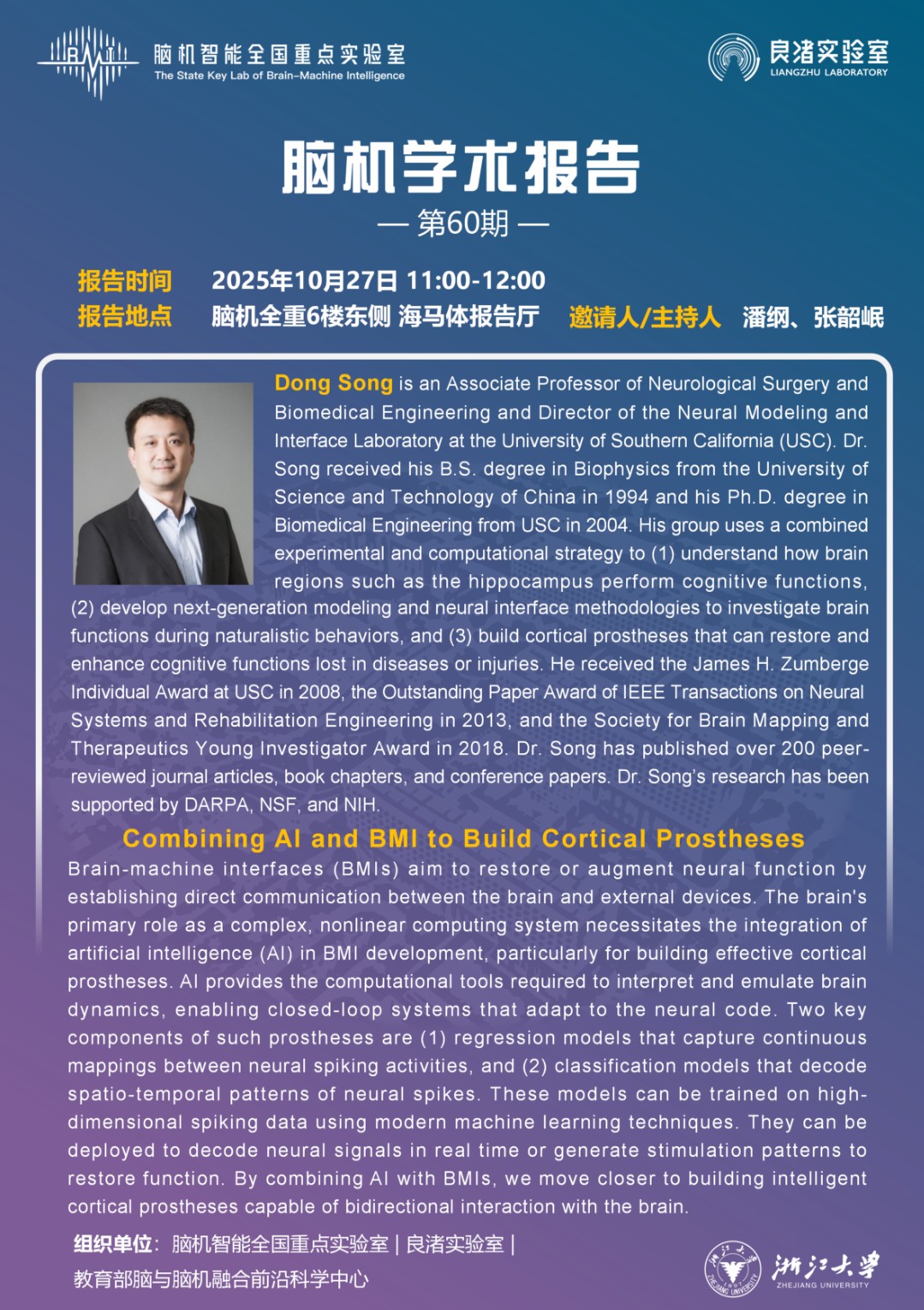 学术报告:Combining Al and BMl to Build Cortical Prostheses——宋东教授(南加州大学)